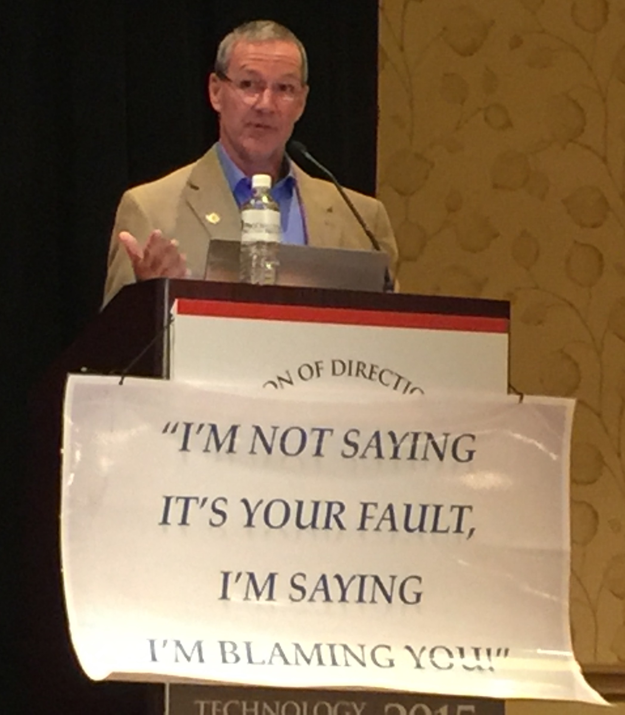 As representative of an operating company, Bosworth admitted that “we’re quick to take credit and quick to blame.” To demonstrate this attitude, Bosworth put up a banner, which read, "I'm not saying it's your fault, I'm saying I'm blaming you." He suggested a better approach of sharing information and collaboration. “You can help us look good and we can help you look good.”