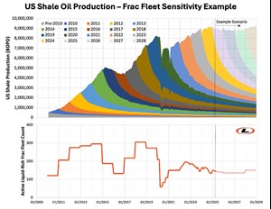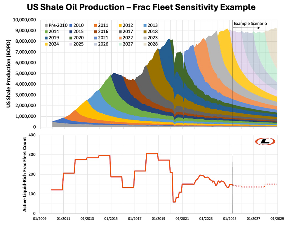 On the other end of the current response to lower prices lies a potential quick response to add frac fleets back to work. If WTI prices would increase again, for example in 2027 or 2028, current near-peak U.S. shale oil production can relatively be easily tappe. In the example scenario below in Fig. 2, the model shows how quickly U.S. oil production can react when frac crew count grows by ~10%—from 135 back to about 150 frac crews by the end of 2027. By the end of 2028, assuming the same frac fleet production metric of 25,000 bopd/fleet still applies, U.S. shale oil production could grow again by 400,000 barrels a bpd.