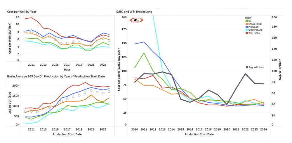 But ultimately it is not about productivity. It is not about cost. It is about production economics. The simplest way to express that, without incorporating a time value of money, is the cost to produce a barrel of oil. In Fig. 3, we have slightly modified this to mean the drilling and completion cost to produce the barrels in the first 365 days of a well’s productive life. The benefit of that metric is that we can measure it (after a year), and that we don’t have to resort to a modeling exercise.