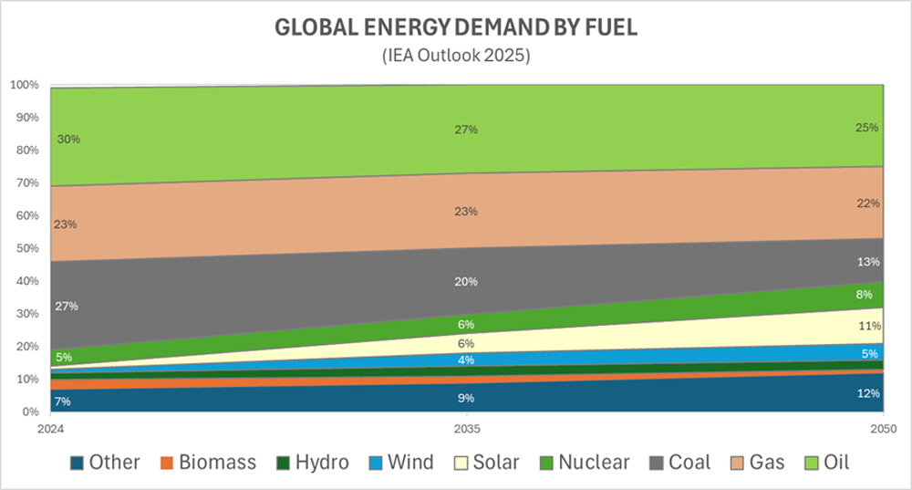 Perhaps in 2025, the world finally woke up to the fact that for the foreseeable future, coal, oil and gas will continue to maintain their dominant role in global energy production. According to the International Energy Agency (IEA), fossil fuels which currently account for 80% of global energy demand are projected to still account for 60% of the total global energy production by 2050 (Figure 1). In a marked contrast to its previous reporting, the IEA no longer sees peak oil demand occurring within their entire 2050 forecast period. As stated in their November 12th release, this revised long-term outlook is due to shifting US decarbonization goals, rapid growth in electricity consumption and slowing adoption of electric vehicles.