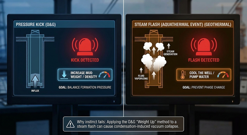 The most immediate operational danger lies in the difference between a pressure kick and a steam flash. Conventional well control training focuses deeply on pressure management. When a driller encounters an influx in an oil well, the standard, ingrained response is to circulate and increase the mud weight, to regain control over the formation pressure. However, this approach fails in geothermal environments. In these operations, the primary danger is not a conventional kick but an aquathermal event, commonly known as a steam flash.