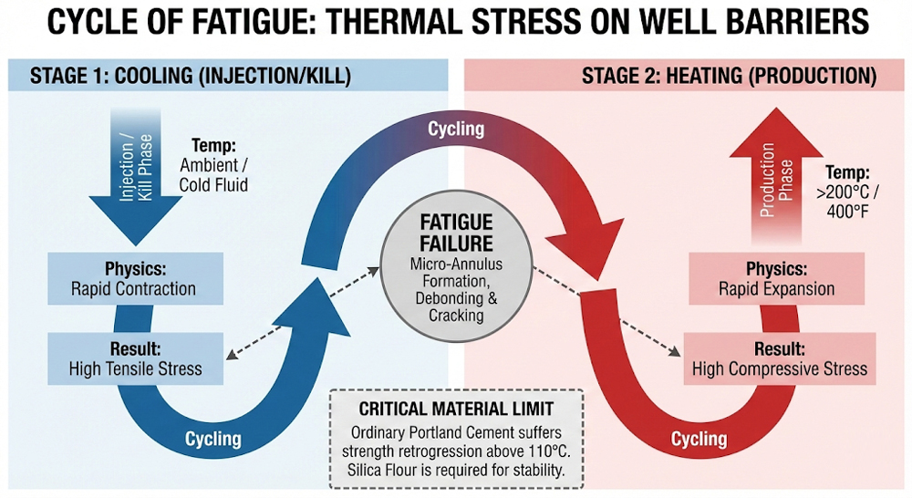 Beyond the immediate risks of well control, geothermal wells face long-term integrity challenges driven by thermal stresses—a problem far less pronounced in most O&G wells. Geothermal barriers are expected to function reliably through extreme and repeated thermal cycles for decades. The continuous expansion and contraction of the casing, the cement sheath and the surrounding rock are the primary drivers of long-term fatigue damage, Fig. 4.