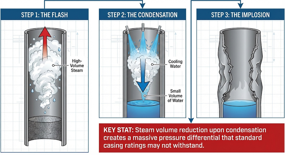 The introduction of a steam phase into the wellbore introduces severe hazards that are virtually unknown in conventional drilling. The first and perhaps most destructive is the risk of vacuum formation and implosion. If a steam-filled wellbore is suddenly cooled without proper pressure management, the steam rapidly condenses back into liquid water. Because steam occupies a significantly larger volume than water, this phase change results in an extreme volume reduction, creating a powerful vacuum inside the casing. This vacuum can be strong enough to cause the casing to collapse inward, resulting in catastrophic well failure, Fig. 3.