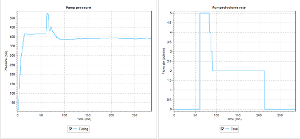 Diagnostic pumping. To accurately determine the leak path within the production casing, marker fluid injection was performed, prior to the commencement of pumping operations. This diagnostic step was critical for validating the existing flow path and ensuring that engineering models were aligned with actual field conditions. The procedure confirmed flow continuity, as evidenced by the near-instantaneous return of marker fluid through the blowout stream. These results reinforced the reliability of the modeled assumptions and provided essential confirmation before full-scale operations began.