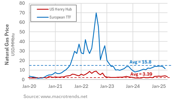 A bit less well-known is the effect that increased oil production has had on the price of natural gas. Each unconventional oil barrel comes with associated natural gas (~4 Mcf/bbl in the Permian, and ~2 Mcf/bbl in the Bakken; at an average of 2Mcf/bbl, unconventional oil accounts for ~30Bcfd or ~30% of U.S. gas production). All this associated gas, along with the imperative to limit flaring and limited capacity to move treated gas to market, has caused the price of gas at the wellhead in unconventional resource plays to remain close to zero for years. Sometimes, it has actually gone negative. For example, the Permian’s Waha hub spot natural gas price was negative for over a month in 2024 and has been negative for 57 trading days in 2025. Something with a negative price is the definition of “trash.”