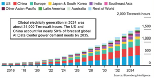 LNG exports are only part of the demand. U.S. and global data center demand for electric power is set to quadruple over the next decade, Fig. 4. Per this Bloomberg projection, the U.S. will need an additional 300 TWhr by 2030. This power will need to be dispatchable—which means 24/7. Wind and solar, no matter how cheap, won’t fit the bill without expensive, nonexistent storage. Nuclear or coal could solve the problem, but coal has 2.25 x the CO2 emissions of combined cycle gas, and nuclear takes years and years to get going. It seems to me that most of this 300 TWhr will be provided by combined cycle gas. That would mean another 6.5 Bcfd by 2030 and yet another 5 Bcfd again by 2035.