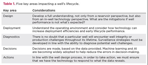In order to fully recognize the potential of this technology, we need to address five key areas, and the impact they have on the well’s lifecycle, Table 1.