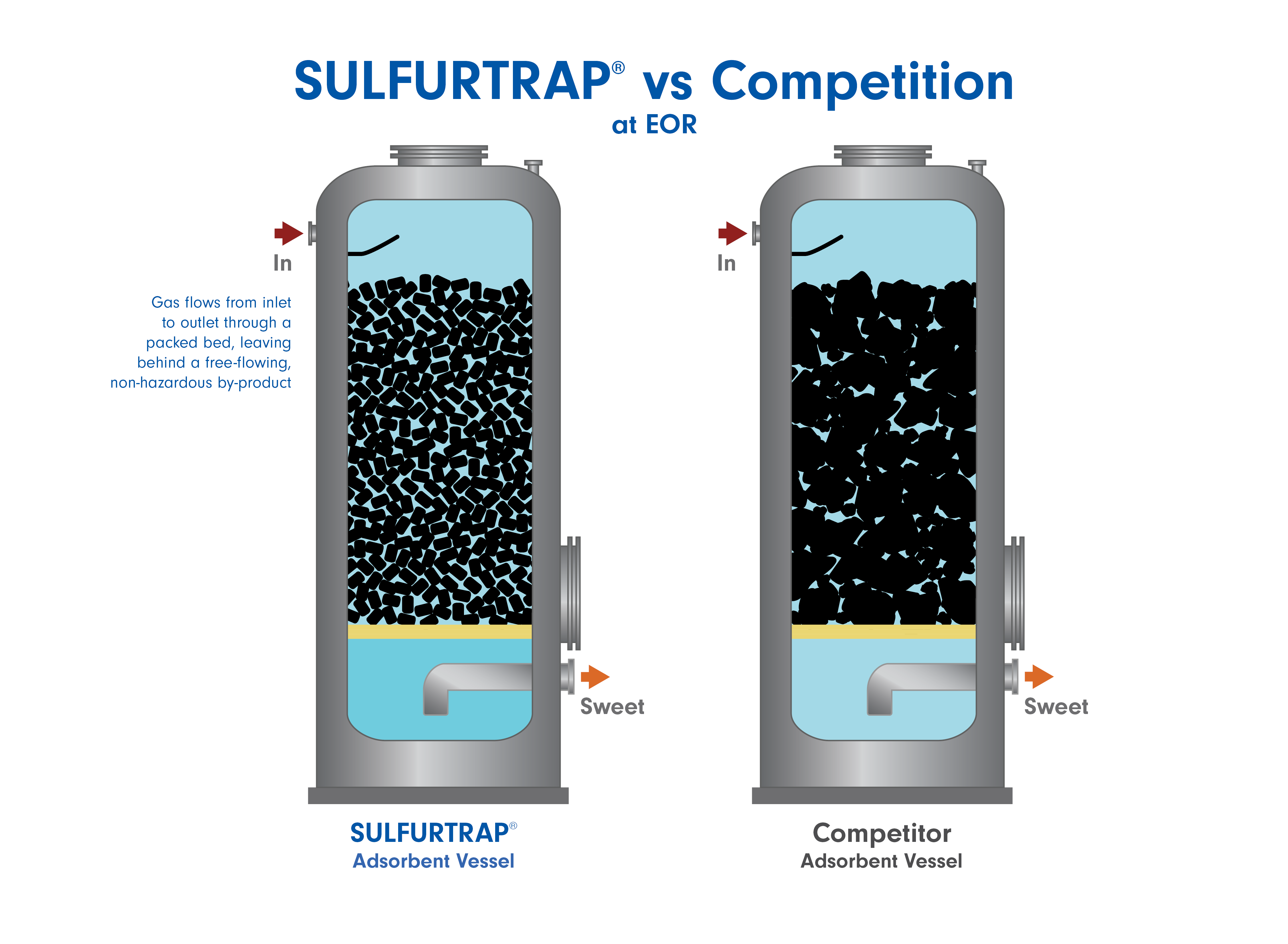 SULFURTRAP’s proprietary composition and manufacturing process assures free-flowing material at the end of life, making the turnarounds easier and safer for operators and maintenance crews. SULFURTRAP purity allows for a sulfur loading capacity two-to-three times higher than conventional products at a lower cost, offering the lowest OPEX available on the market. SULFURTRAP can be used to remove H2S from any gas stream and from light liquid hydrocarbon streams, with an add-on bonus of removing small quantities of light mercaptans and oxygen, further preventing corrosion issues.