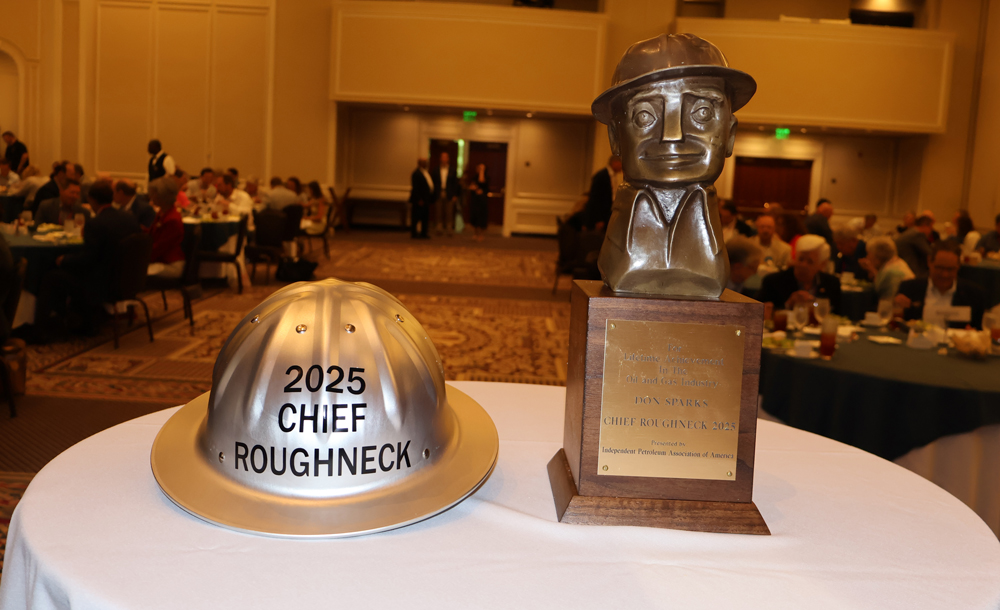 Chief Roughneck Award. A mainstay and favorite for attendees is the annual presentation of the Chief Roughneck Award (Fig. 4), IPAA’s highest honor. The Chief Roughneck lifetime achievement award dates back to 1955 and has included pioneers in the industry. Don Sparks, co-founder and chairman of the board of Midland, Texas-based Discovery Operating, Inc., was the 2025 recipient.