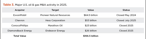 January 2025 saw the Federal Trade Commission grant final approval to two very large oil and gas mergers: ExxonMobil’s $64.5 billion acquisition of Pioneer Natural Resources and Chevron’s $53 billion purchase of Hess Corporation, Table 3. The approvals came with significant conditions—FTC Chair Lina Khan barred Pioneer CEO Scott Sheffield from serving on ExxonMobil’s board after uncovering “troubling evidence” of communications with OPEC representatives, aimed at cutting oil production to raise prices.