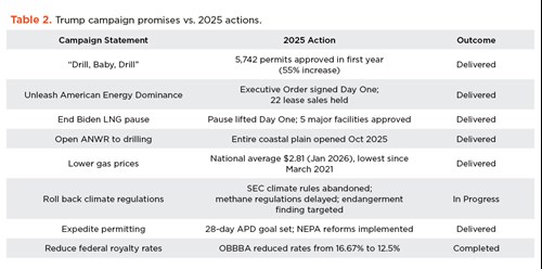 Although the administration says it was not following the Heritage Foundation’s Project 2025, officials do seem to have accomplished most of its agenda, Table 1. Furthermore, if one examines a list of Trump campaign promises on energy, you will find that most of them have been fulfilled, Table 2. As the administration enters its second year, the question facing industry executives, policymakers, and environmental advocates alike is simple: what comes next?