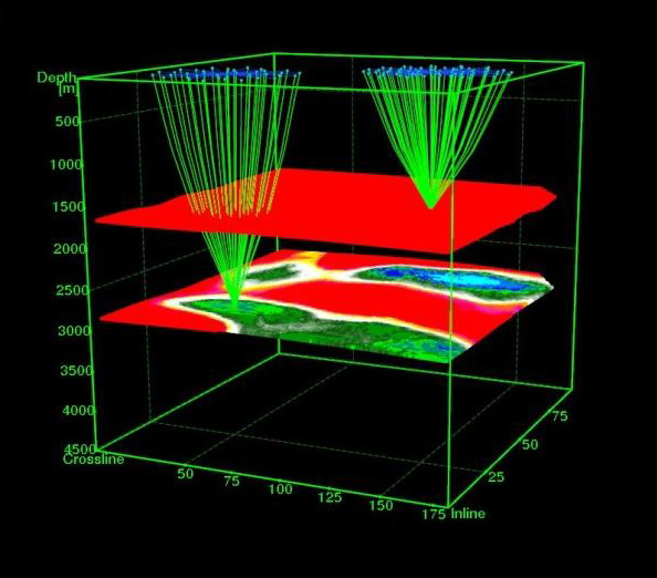 Ray trace modeling involves the use of specialist software, which, on the basis of regional geology and previous seismic surveys, calculates the optimum layout of elastic-wave transmitting and receiving equipment.