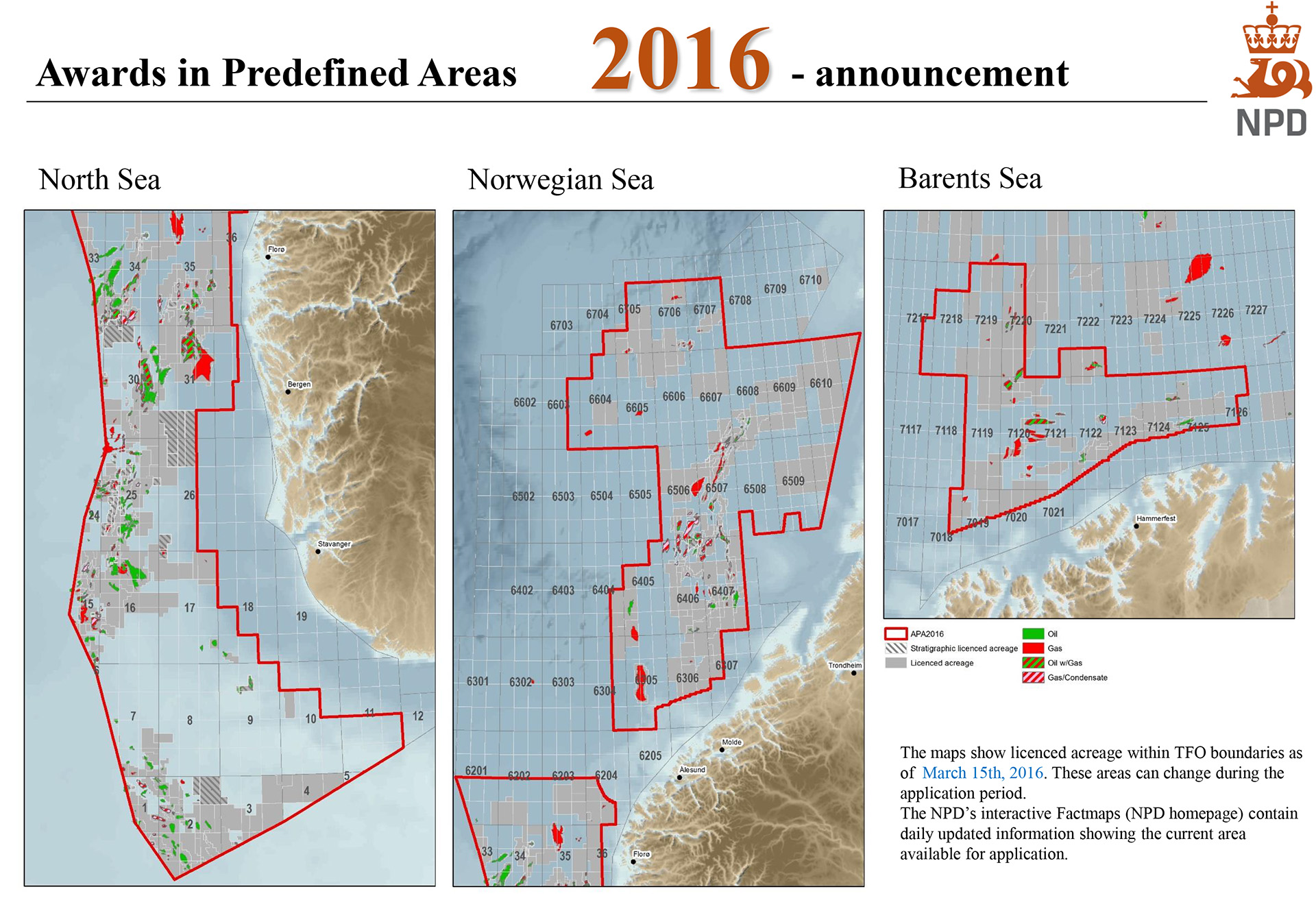 The predefined areas have been extended since APA 2015. The new areas include 24 blocks in the Norwegian Sea and 32 blocks in the Barent Sea.