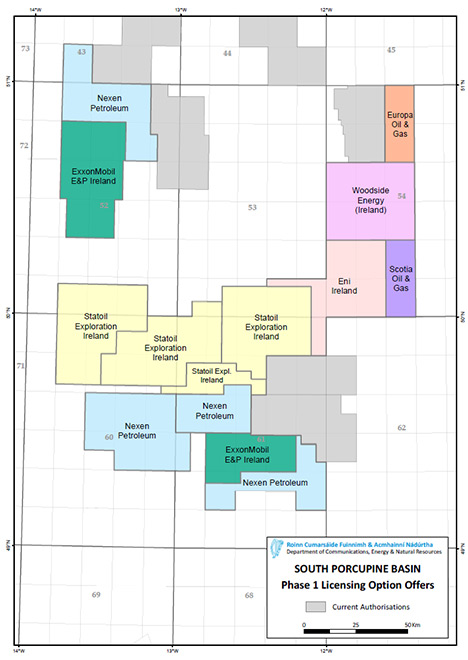 The six Licensing Options awarded to Statoil total approximately 7,700 km2 in the Porcupine basin in water depths ranging from 1,100 m to 3,150 m. Statoil and Exxon Mobil each hold 50% equity in all the Licensing Options.