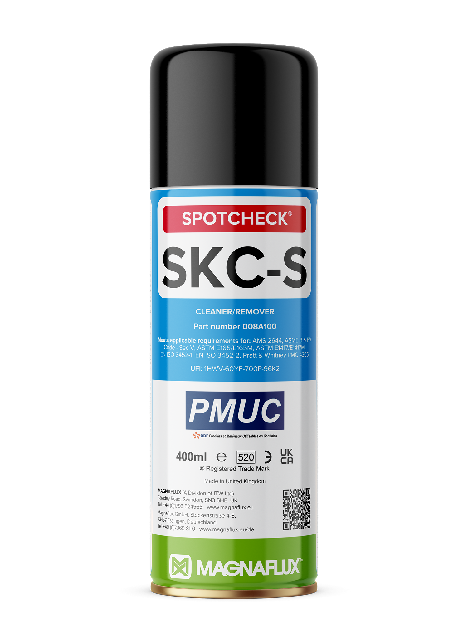 SKC-S is an NDT-approved solvent cleaner/remover for pre-cleaning before non-destructive testing and for removing excess surface penetrant from an inspection area before applying developer during liquid penetrant testing.