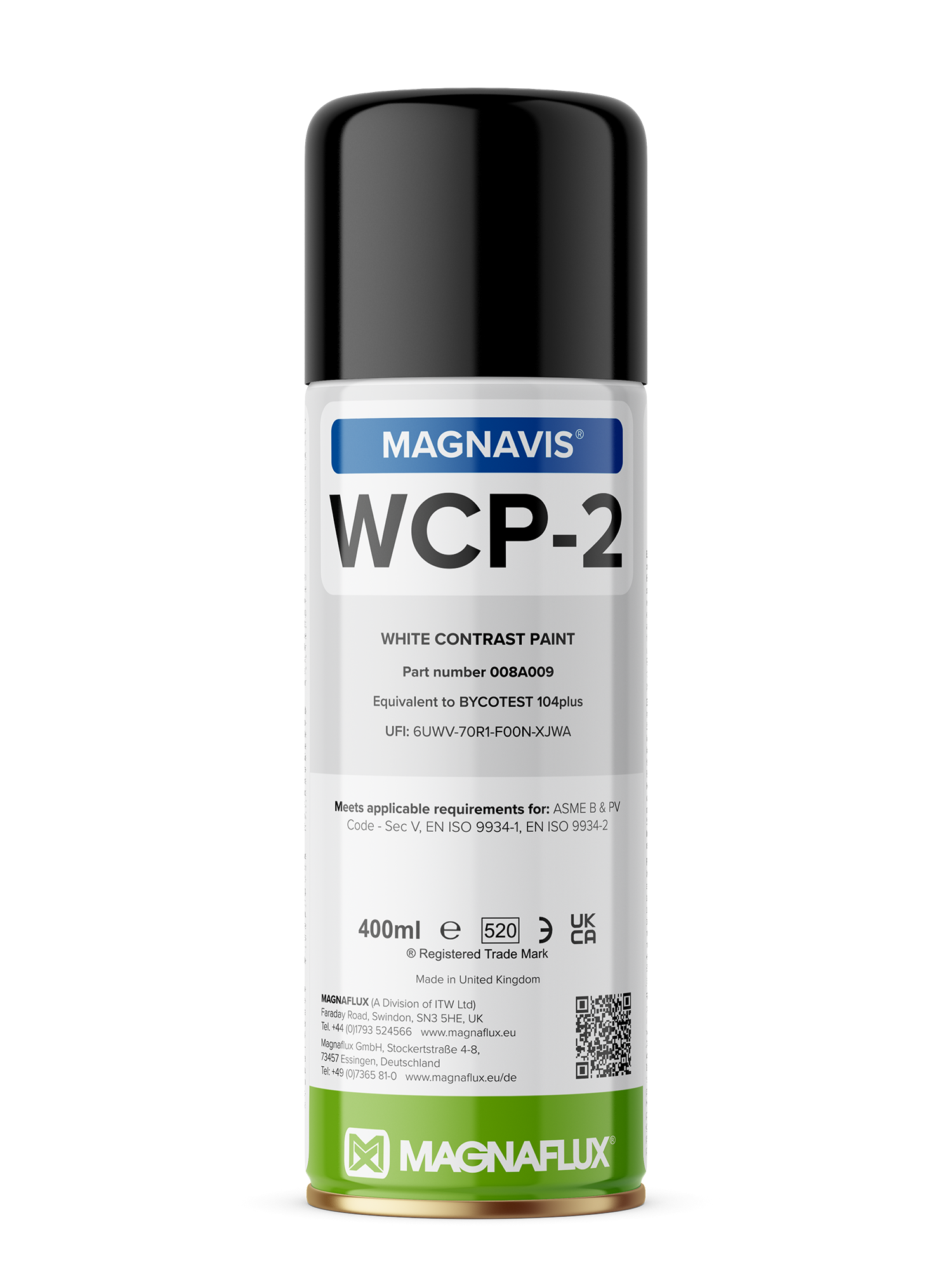 A bright white, opaque NDT contrast paint, WCP-2 provides a high contrast background to enhance visible indications on dark-colored test surfaces and improve probability of detection and sensitivity during visible magnetic particle inspections.