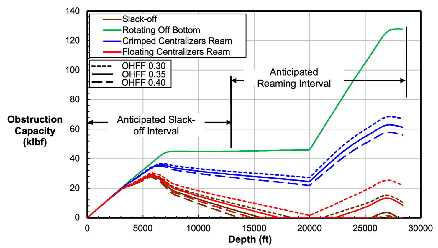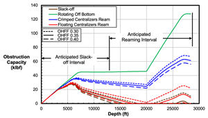 The effectiveness of the crimped centralizer solution for running operations is highlighted using another simple running metric that complements the hookload chart, defined here as the obstruction capacity. The obstruction capacity represents the highest downhole axial load that could be applied to an obstruction at the end of the casing string if the surface hookload were completely slacked off and can be thought of as equivalent to the maximum available weight on bit. (Fig. 5) compares the obstruction capacity of the floating and fixed centralizer solutions as a function of run depth and shows that when the string with fixed centralizers is rotated, a substantial change is available in downhole force to propel the string forward. Utilizing VolantRED™, Volant includes obstruction capacity estimates in all pre- and post-run customer running optimization assessments and generally finds good alignment between this metric and the onset of running challenges.