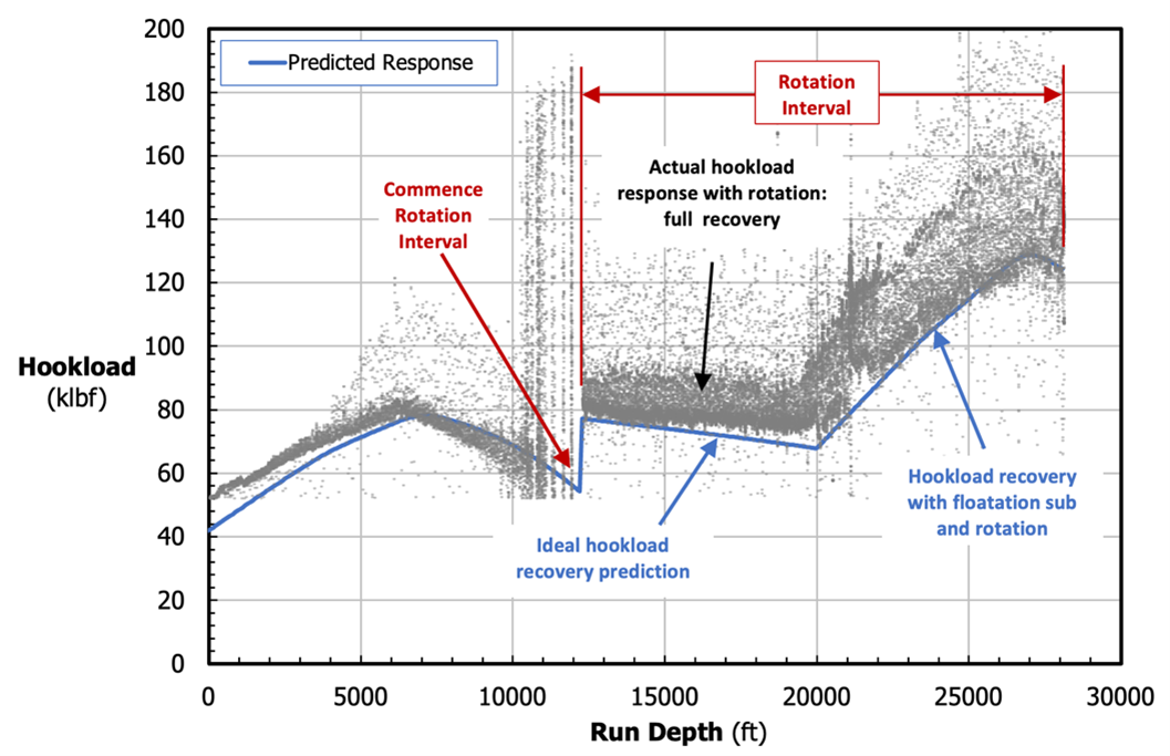 Casing strings combined with flotation subs and crimped HydroFORM™ centralizers have been successfully landed to target depths of over 32,000 ft, in wells with lateral lengths of more than 4.8 miles, using Volant (CRTe-1.0 & 2.0 GM5.50) external grip casing running tools on every subsequent well for the operator featured in the case study. Rotation for many of the horizontal sections results in efficient progress with sustained hookload. In the vast majority of runs, operators begin rotating early enough in the run to avoid any reciprocation prior to flotation sub installation and sustain this running mode for the remainder of the horizontal section.