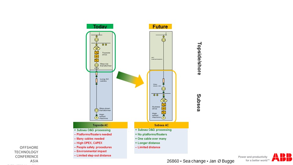 Today, most of the equipment in an offshore oil and gas system is found topside, but as the figure below shows, in the future almost everything will be moved below the surface. That means that the power to run all that equipment must be sent to the sea floor and distributed among a variety of different loads.