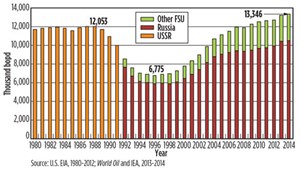 Russian oil activity. Meanwhile, Russian producers have pumped oil like there’s no tomorrow, and Putin does not seem inclined to rein them in. As the chart on this page indicates, Russian producers have done their part to over-supply the global oil market. Over the last 11 years, between 2003 and 2014, Russian oil production has grown 29%, from 8.1 MMbpd to nearly 10.5 MMbpd. During that same period, Russian drilling rose about 108%, from a low of 3,527 wells in 2004 to a high of 7,365 in 2013, followed by about 7,000 wells in 2014. Overall FSU production is now 10.7% higher than the Soviet Union peak of 12.053 MMbopd in 1988.