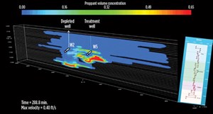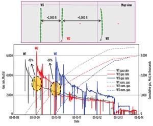 An integrated analysis of fracture interference revealed that hydraulic fracture system damage was, most likely, due to stimulation fluid flooding, into depleted fracture systems around parent wells, resulting in a reduction in the effective fracture area. The team proposed a number of options to mitigate the impact of fracture interference, including refracturing the existing producing well with an energized fluid.
