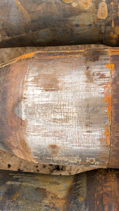 Therefore, application of a new layer of hardbanding can effectively mask the presence of heat checking while actually introducing damage to the parent metal. Repeated applications over heat-checked hardbands will result in transverse cracks, which act as stress risers and lead to twist-offs. This is why it is critical to identify, cull and repair these defects through an effective pre-weld inspection program.