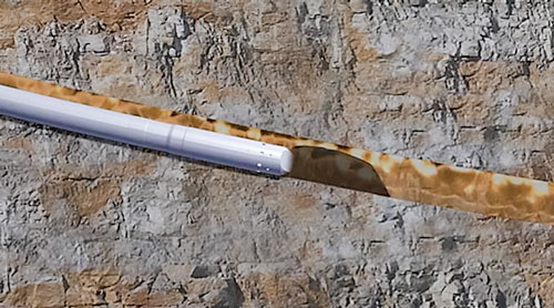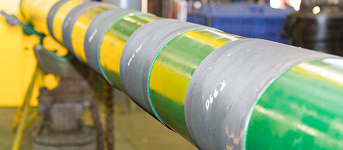 External coatings. After increasing the system’s torque rating, engineers started testing the external coatings on the expandable pipe. These coatings are an important feature to protect the pipe, if the SET liner is rotated in one position for an extended time. This is a typical occurrence during the displacement of cement, when the liner is rotated without moving the pipe. The coating covers a short section that is positioned at the base of the casing shoe and prevents damage from the metal-on-metal contact. Several coatings were tested that proved to be effective in protecting the expandable pipe. The coatings are applied to the pipe prior to arrival at the rig site.