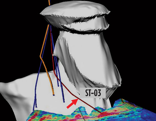 To solve the instability issues, a third sidetrack was designed with a “planned-in” SET liner. The SET liner, in combination with a conventional casing string, was used to successfully isolate the depleted section, enabling fluid density management to allow the well to be drilled successfully to the planned TD, Fig. 2. Since the added casing string was a solid expandable, it enabled the originally planned production casing to be set. ST-03 tapped into a new reservoir, and the well ultimately was brought on production. The discovery justified a full-field development.