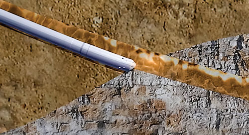 Formation changes and ledges. Changes in formation type and formation strength can lead to ledges and an irregular directional wellbore. As the drill bit encounters a harder formation, ROP slows, and this can lead to a wash-out of the softer formation directly above. This situation creates a ledge that successive BHAs must negotiate. A drilling BHA is more flexible than casing or liner strings, and it may appear that the ledge was “wiped out,” only to reappear when casing is being run, causing a hang-up. The ESET system’s eccentric guide nose can be used to help rotate off a ledge enabling a one-way trip to section TD, Fig. 5.