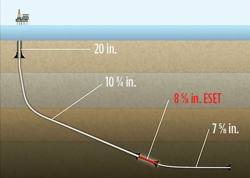 In the last 18 months, over 8,000 ft of ESET liner have been installed in highly-deviated directional wellbores. In one application, a major operator in the Norwegian North Sea was planning to drill a 12¼×13½-in. hole section. If problems were encountered, it would force the operator to set the 10¾-in. casing early. This would leave a section of overburden exposed above the reservoir, which would need to be isolated before drilling could continue. Conventional practice would utilize a 75/8-in. liner to isolate the overburden and 5½-in. pipe across the reservoir, greatly reducing production capability. Instead, an 85/8-in. hi-collapse ESET liner was selected as a planned contingency system, as this would provide an 8½-in. post expanded drift and allow the 75/8-in. liner to isolate the reservoir section.
