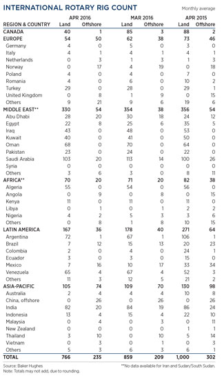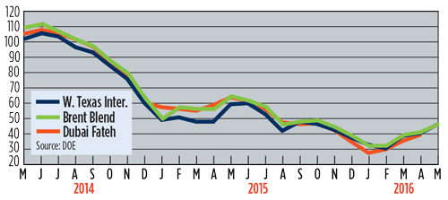 Crude markets continued to strengthen in May, when unexpected supply disruptions in Nigeria, Venezuela and Canada reduced output by approximately 1.5 MMbopd. These outages, combined with falling U.S. production (8.8 MMbopd), caused stockpiles at Cushing, Okla., to decline by 3.4 MMbbl during the week ended May 6, and again by 4.2 MMbbl during the third week of the month. Russian production declined for the first time in nine months, averaging 10.8 MMbopd in April, with Saudi Arabia unchanged at 10.2 MMbopd. The combination of these factors briefly pushed WTI and Brent benchmarks above $50/bbl for the first time in six months. The international rig count dropped 67 units to average 1,001 working units in April. U.S. activity continued to plunge, dropping 7% to average 409 rigs in May.