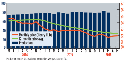 U.S. GAS PRICES ($/MCF) AND PRODUCTION (BCFD) GRAPH
