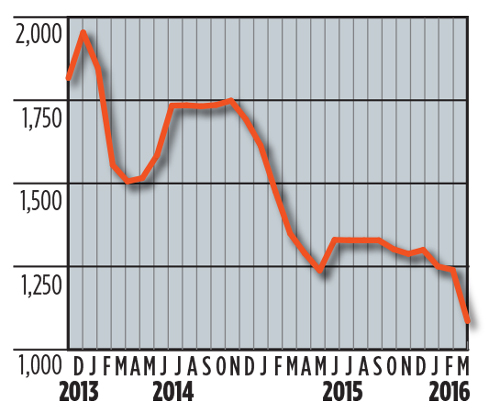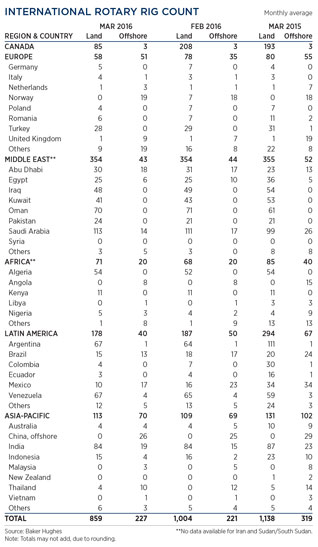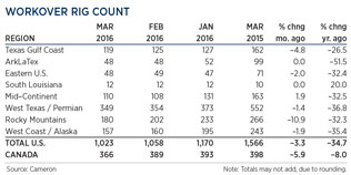 Crude prices surged to four-month highs in April, on falling U.S. output and evidence that further declines are imminent, due to historically low rig activity. Conversely, Russian production hit a 29-year high in March, at 10.91 MMbopd, but Saudi Arabia, exercising restraint, held output steady at 10.12 MMbopd. Despite persisting oversupply at the time of writing, WTI was trading at $45.35/bbl, with Brent at $47.24/bbl. International rig activity was down 12% to 1,086, with the annual spring thaw in Canada idling 123 land rigs. The average U.S. rig count continues its unpresented decline, with just 443 rigs active in April, a drop of 8%, or 36 units, compared to the previous month.