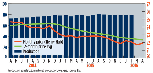 U.S. GAS PRICES ($/MCF) AND PRODUCTION (BCFD) GRAPH