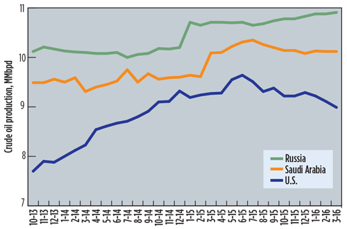 WORLD CRUDE OIL PRODUCTION, TOP THREE PRODUCERS