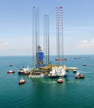 The oversized jackup measures 344×291×39 ft, is rated with a 2 million-lb hookload, a cantilever envelope of 110×74 ft, and 140 personnel onboard (POB) capacity. The Lloyd Noble is capable of operating in up to 500 ft of water, at well depths of at least 32,000 ft. Importantly, its 702-ft legs provide a 250-ft air gap between sea level and the rig, to prevent the excessive slamming loads of high North Sea waves.
