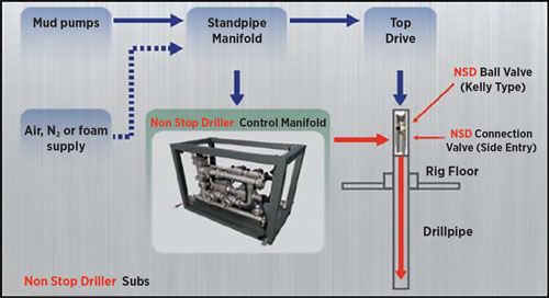 The CCS used rig pumps to provide continuous circulation down the drillstring while making or breaking drill pipe connections, Fig. 1. The system consists of a ball valve and a custom-designed high-pressure side entry valve housed in CCS drill pipe subs. Circulation is maintained throughout the connection by circulating into the side entry valve via a manifold interfaced with the rig standpipe manifold, a hose, and quick connector. A ball valve in the CCS sub is closed to bleed off pressure above it, allowing the drill pipe connection to be broken and a new stand made up while full circulation continues via the side entry valve.