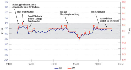 Stopping and starting the rig’s circulation system is a primary source of drilling NPT resulting in lost circulation, kicks, sloughing, stuck pipe, and differential sticking. A key drilling strategy was to use CCS to keep the pumps running at all times to provide a safe, simple, effective MPD solution. Figure 3 illustrates making a connection with the CCS system to maintain +/– 15 psi BHP control accuracy during drill pipe MPD connections. An additional 100 psi MPD ASBP was applied during the connection to compensate for the loss of drilling ROP and RPM.