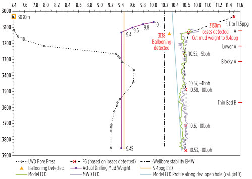 The mud weight was reduced to 9.4 ppg when mud losses were detected by the MPD system. Increased return flow was detected within 8 m of drilling, when ECD fell below 10.3 ppg when rig pumps were cycled for an MWD directional survey. After that point, ECD was maintained above 10.3 ppg EMW to prevent flow back from the formation. The formation pore pressure ramped up to 9.62 ppg as drilling continued into the formation. Minor mud losses were observed in the B formation if ECD exceeded 10.6 ppg EMW.
