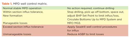 Well control simulations. An MPD well control matrix was prepared detailing well control actions to be taken by the MPD operator and driller once an influx was detected and confirmed, Table 1.