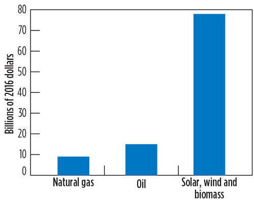 Accordingly, Fig. 2 excludes federal support for hydro and geothermal, and shows only subsidies for solar, wind and biomass. These figures show that during the 2011-2016 period, these renewable technologies received $78 billion, which is: