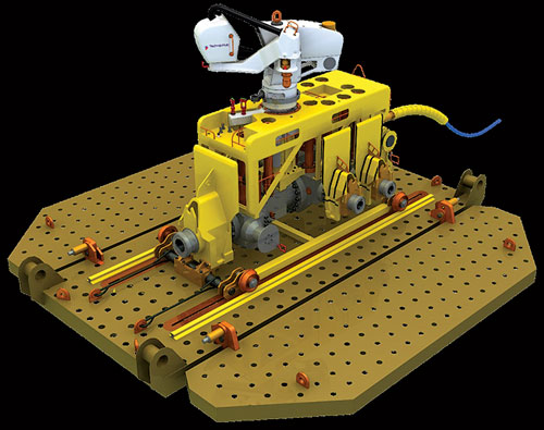 The In-Line Compact Robotic Manifold from TechnipFMC is transforming the traditional manifold design to improve subsea economics. The compact manifold reduces size, weight and manufacturing cost and incorporates a robotic arm for valve actuation. For more information, please see the Technology at OTC section on page 40.