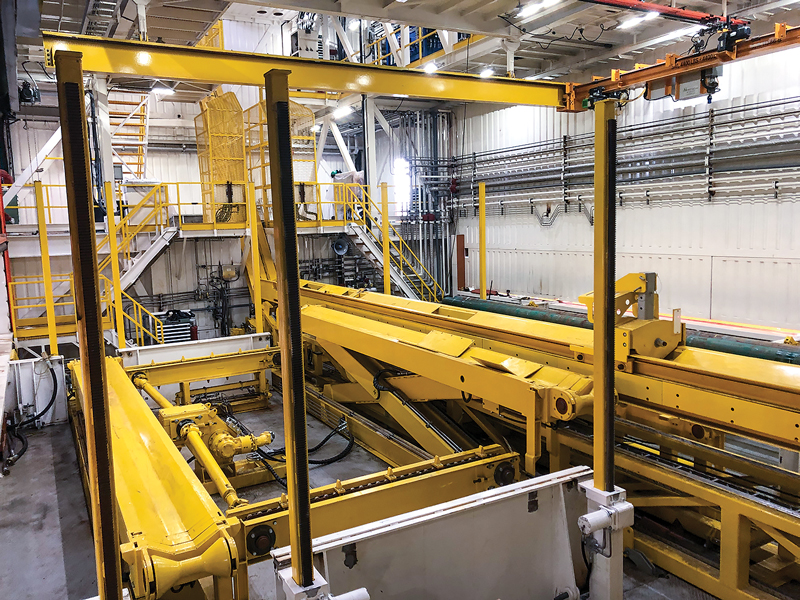 Iron roughnecks optimize operations. The rig also incorporates two iron roughnecks. The primary roughneck, an ST-120, is for well center and mousehole applications, but a second unit, an ST-100, was added specifically for offline stand-building. To reduce NPT during drilling operations, the rig-crew can bring drill pipe up through the pipe chute, three joints of pipe at a time. Inside the racking board, a bridge crane is then used as a hoisting system, enabling the operator to come down and pick up three sets of pipe to the floor. The first two sets are grabbed and set in the hole, then the third is grabbed and stabbed into the first one. The iron roughneck is then used to make up the connection, the double stand is pulled up out of the hole and set in the next mousehole, and the iron roughneck comes a little further, torques up that last joint, and then the bridge crane can be used to position it, either in the setback or well center after drilling of that section of the well is done.