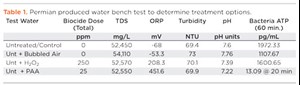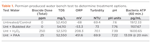 The data required to determine potential treatment options do not always direct operators to one discrete treatment over the other. The outcome of a bench test performed in October 2018 in the Permian (Table 1) indicated a combination of treatments was likely the best solution. In this case, the operator was transferring produced water into a storage pit. The test water scenarios included raw produced water; water after a few hours of exposure to bubbled air to simulate aeration; a sample with H2O2 as a bulk oxidizer for pit-water quality improvement; and a sample treated with peracetic acid. Results indicated in this particular water, that aeration, alone, was not enough to elevate the ORP to positive, but the addition of either chemical did elevate the ORP. None of the treatments materially improved the turbidity of the water. Improving turbidity in this case would either require more settling time, clarification chemicals, or other separation equipment. Ultimately, the prescribed treatment was a combination of pit aeration for maintenance and PAA, which demonstrated effectiveness as a primary disinfectant