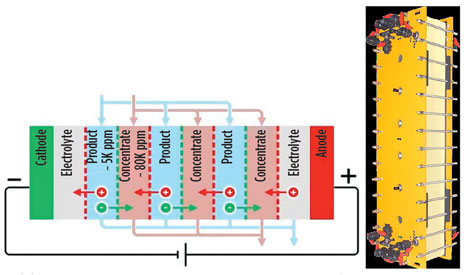 The solution involves leveraging a 40-year-old, low pressure electrodialysis reversal (EDR) membrane technology used for desalination. EDR underwent recent innovations in membrane composition, stack design, and process controls that enable its use on produced waters without extensive pre-treatment. Electrodialysis reversal (EDR) avoids the use of pressure difference across membranes, which is one contributor to fouling in a RO system, in favor of driving desalination by applying electricity across ion exchange membranes to separate ions by charge, Fig. 1.