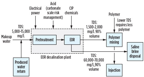 An electrodialysis reversal (EDR) system, that requires minimal pretreatment with innovative hydrocarbon anti-fouling ion exchange membranes, was packaged in rugged skids with advanced process controls. The EDR plant can: 1) desalt EOR produced water from up to 20,000 mg/L, total dissolved solids (TDS), down to 500-5,000 mg/L for reinjection; and 2) reduce polymer requirements to decrease chemical costs in polymer flood operations. EDR desalts via an electric field—dissolved ions in the produced water are moved across ion exchange membranes, desalting one stream while concentrating a smaller volume discharge. The TDS in the produced water can be desalted to any concentration that provides optimal performance specific to the reservoir.