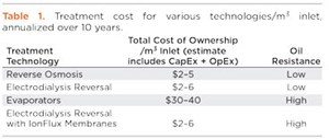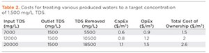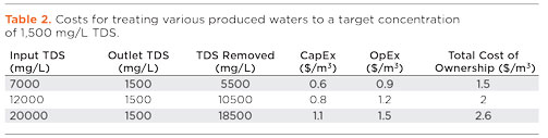Although site economics will vary, as a guide, a typical 1,000-to-4,000 m3/day polymer injection site may consume $2 million to $10 million/year in polymer operating cost. For the sake of this work and aligned with the pilot on 7,000 mg/L TDS inlet, it is assumed that polymer costs amount to $5.5/m3 injected without desalination. The 65% polymer cost-savings could amount to $2.5/m3 in polymer savings. On the cost side of the equation, Table 2 highlights various scenarios, where different input concentrations of TDS are treated to a target of 1,500 mg/L TDS, and the change in capital and operating expenses/m3 of water treated is annualized over 10 years. The 7,000 mg/L scenario results in an estimated total cost of ownership of roughly $1.5/m3, vs the polymer cost-savings presented above of $2.5/m3.