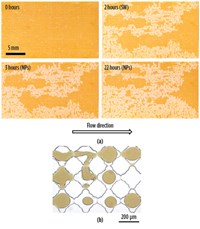 From the image analysis, quantification of crude oil recovered during ASW flooding and HSNs flooding was made. The recovery curve is shown in Fig. 5. Crude oil recovery during ASW flooding was about 33%. Injection of 2,000-ppm HSNs in ASW, after secondary ASW flooding, didn’t recover any significant amount of oil for several hours. But after a few hours, HSNs suspension started to produce oil from the un-swept region. It appears that the oil swelling required several hours to occur, as was observed during the dead-end-pore micromodel experiment. This helped to divert injected HSNs suspension toward the regions that were un-swept during ASW flooding.