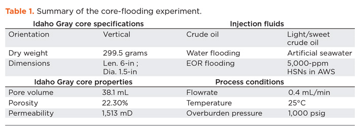 Core-flooding setup design. The core-flooding setup consisted of a hydrostatic core holder for confining core sample; a vacuum pump for removing air from the core; floating piston accumulators and injection pumps for injecting ASW, crude oil and HSNs fluids into the core. It also included a mineral oil pump for applying overburden pressure, and a fraction collector for collecting outlet samples at regular intervals. An Idaho Gray core sample was used for the core-flooding experiment. The core sample’s external surface was cleaned thoroughly in running deionized water, then dried in an oven at 100°C to evaporate the water until the weight of the dried cores stopped changing. Dried cores were scanned on an X-ray CT scanner to visualize core internals and ensure that they were free of abnormal defects, cracks, vugs and non- homogeneity. Following cleaning, core samples were placed in the core holder, overburden pressure was applied, and air was removed from the core. Effective pore volume (PV) was measured by injecting ASW in the core, using fluid a re-saturation method (pore volume = fluid injected – fluid collected – dead volume).