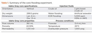 HSNs flooding through Idaho Gray core on core-flooding setup. HSNs suspension prepared in ASW was evaluated for oil recovery on a core-flooding setup, to determine whether the findings from micromodels can be applied at the core scale. The core-flooding experiment was conducted on the light-and-sweet crude oil-saturated high-permeability Idaho Gray core. Core was dried, vacuumed and then saturated with ASW. The pore volume was measured, and porosity was calculated. Following this, ASW was injected in the core, and differential pressure at different flowrates was measured to calculate the permeability, Table 1.